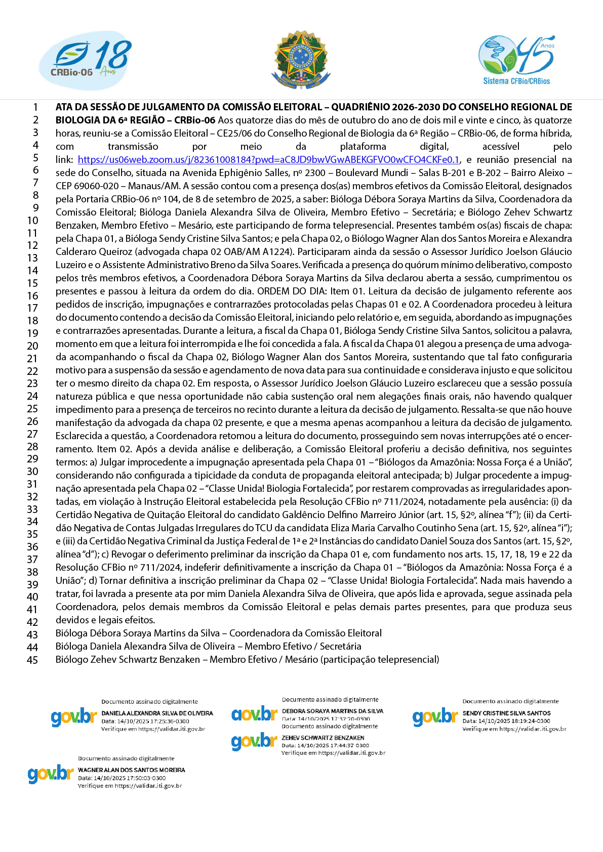 A Comissão Eleitoral do CRBio-06 reuniu-se em 14 de outubro de 2025, em sessão híbrida, para leitura e deliberação da decisão sobre as impugnações e contrarrazões das Chapas 01 e 02. Durante a sessão, foram apresentados os fundamentos legais e o resultado do julgamento, que manteve o indeferimento definitivo da Chapa 01 – “Biólogos da Amazônia: Nossa Força é a União” e confirmou a inscrição definitiva da Chapa 02 – “Classe Unida! Biologia Fortalecida”, conforme a Resolução CFBio nº 711/2024.