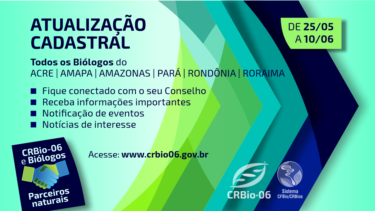 O CRBio-06 convoca todos os Biólogos Registrados dos Estados do Acre, Amapá, Amazonas, Pará, Rondônia e Roraima a atualizarem seus dados cadastrais de endereço, telefone e e-mail. A atualização é importante para que o Conselho fique conectado com o Profissional, permitindo o envio de informações importantes, notificação de eventos, notícias de interesse e documentos.